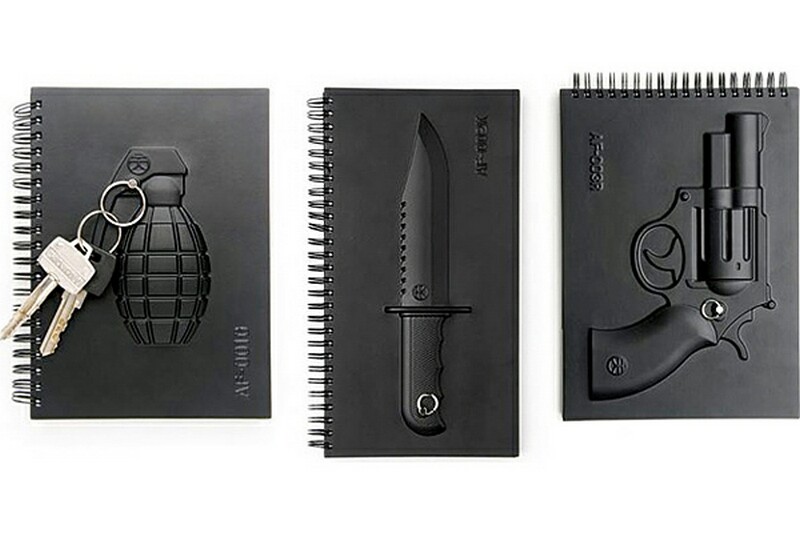 3D creative notebook covers with unique pages in between created by Molla Space. Comes in three, (Revolver, Knife and Grenade) cool weapon molded covers to show your secret and dangerous notebook. :D